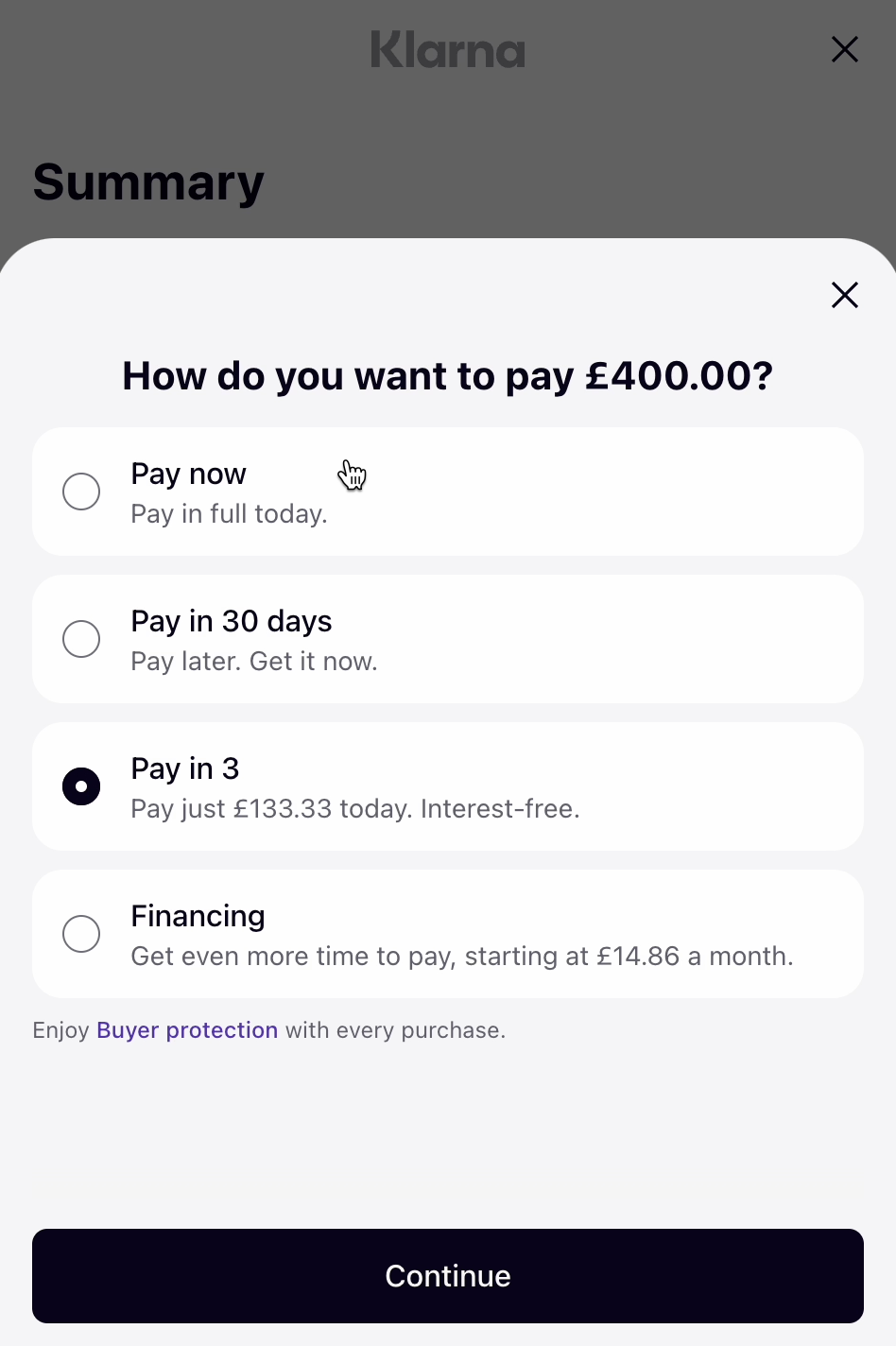 Klarna yhdistää kaikki maksutavat yhdeksi maksuvaihtoehdoksi. Tarkista, miltä se näyttää asiakkaillesi alla: