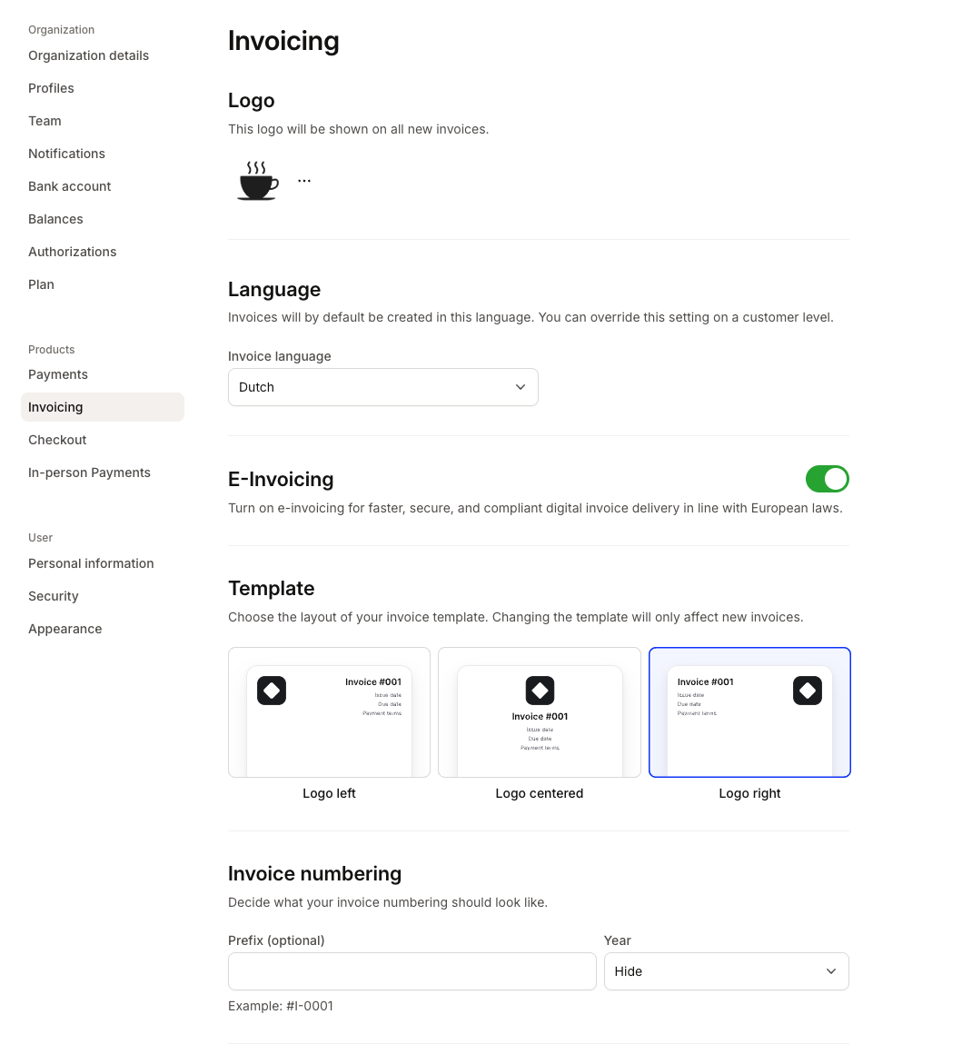 - Disponibilità: La fatturazione elettronica (e-invoicing) è attualmente supportata solo per i mittenti e i destinatari nei Paesi Bassi, Belgio e Germania. Puoi inviare una fattura elettronica solo se la tua azienda è basata nei NL/BE/DE e il tuo cliente è anch'esso basato nei NL/BE/DE.