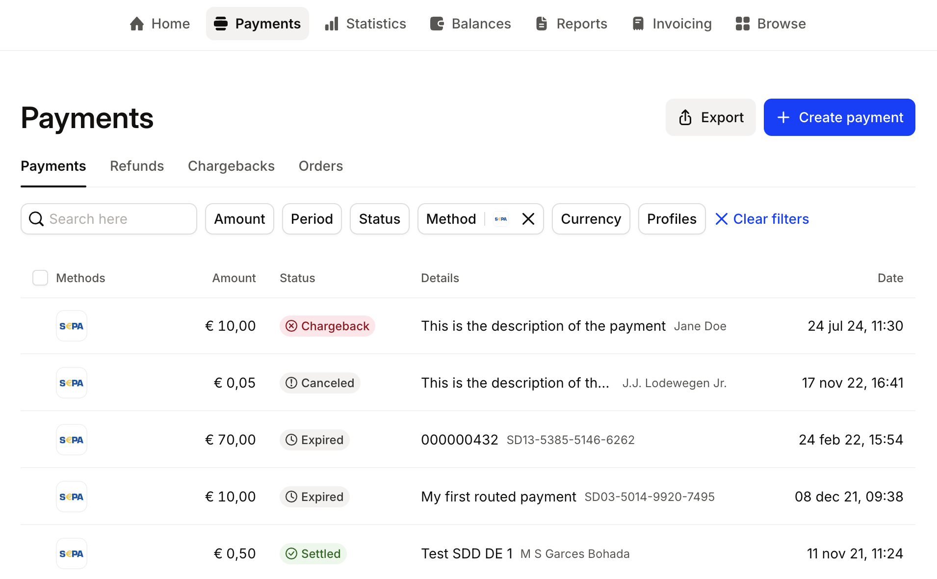 Du kan se alle transaksjonene dine og filtrere dem etter Metode (SEPA direkte debet) for å se status og historikk.