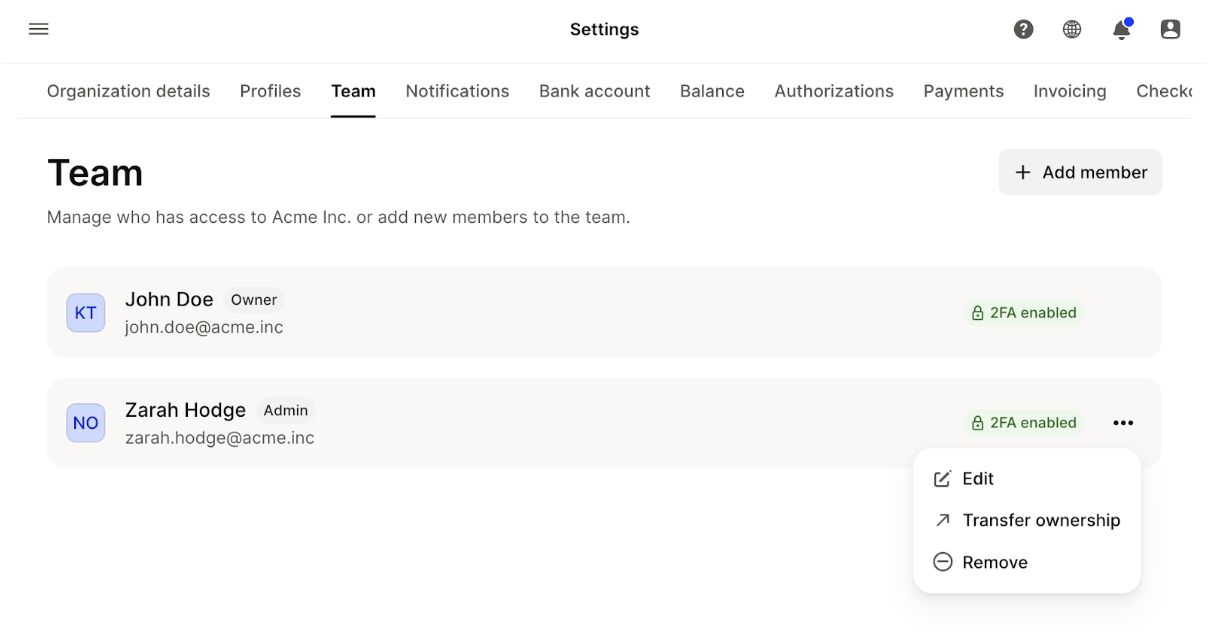 Avšak, organizácie sa vyvíjajú. Štruktúry tímov sa menia a niekedy by malo vlastníctvo účtu Mollie odrážať tieto zmeny. Keď je to potrebné, aktuálny vlastník organizácie môže previesť vlastníctvo na iného používateľa v tímu.